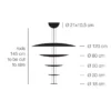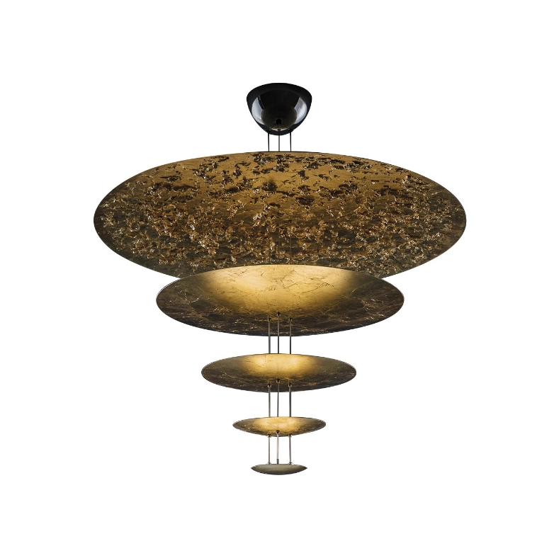 Sorgente Luminosa: LED 24V DC, 10x6W, K 2700 – lumen 6300 – CRI 80 -220-240V – Triac dimmerabile – Dimensioni: base Ø 21×10,5 H cm, aste H 145 cm tagliabili a misura, dischi Ø 120-80-50-30-18 cm