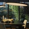 Bogotà è un nome rotondo, morbido che rappresenta perfettamente questa lampada a sospensione, disegnata da Massimiliano Raggi e prodotta dal marchio Contardi. Un elemento leggero, fluido come un oggetto lanciato in alto e che resta sospeso. Un’idea di leggerezza e allo stesso tempo di materia che dichiari la sua contemporaneità e che si inserisca nei nostri interni con decisione ed eleganza. La parte luminosa rivestita in paglia di Vienna inserita in questo ovale laccato nero ha un sapore vintage e molto attuale, uno stile che ci rimanda ad alcuni interni degli anni 60-70 del modernismo brasiliano e sudamericano. La versione con la parte centrale rivestita in tessuto stampa marmo è più assoluta ma sempre identificativa ed attuale. Disponibile anche con paralume in tessuto di cotone bianco.
