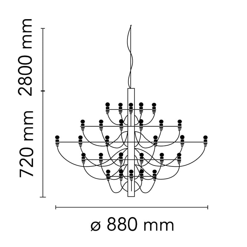 Sorgente luminosa: 30 x MAX 15W – LED 2W E14 95 lumen – IP20 – 220-250V – Regolabile da remoto (dimmer non incluso). Dimensioni: Ø. 880mm – H. 720mm