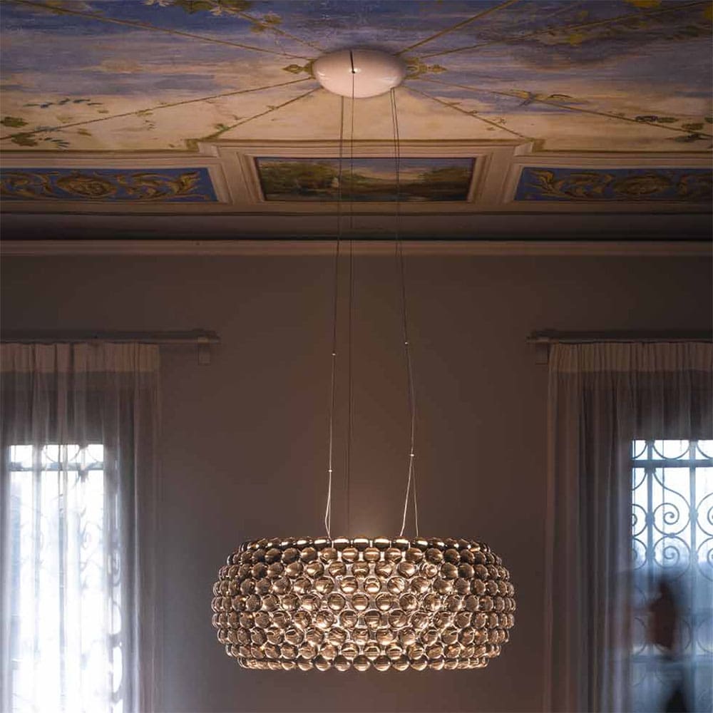 Caboche Plus Media R7s Sospensione del marchio Foscarini, design di Patricia Urquiola con Eliana Gerotto, è una lampada a sospensione a luce diffusa che combina eleganza e innovazione tecnologica. La struttura è composta da archi in PC trasparente, sui quali sono applicate sfere in PMMA con il nuovo sistema twist lock, che garantisce un effetto di trasparenza totale e una luce uniforme. Il corpo luminoso è costituito da due lastre in acciaio verniciate a polvere, che incorporano una scheda LED bifacciale progettata specificamente per questa collezione. Perfetta per ambienti moderni o classici, Caboche Plus crea un’atmosfera luminosa e raffinata, adattandosi a salotti, sale da pranzo o spazi commerciali. Un vero gioiello di design che trasforma la luce in arte.