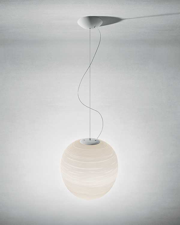 Una vibrazione fluida sul vetro. La lampada a sospensione Gem è un oggetto che seduce, dichiarando a prima vista la preziosità del materiale e la sapienza della lavorazione artigianale. L’irregolarità della superficie vetrosa, con onde e rilievi che mutano continuamente, rende la lampada inconfondibile anche da spenta e crea inattesi effetti luminosi quando è accesa.