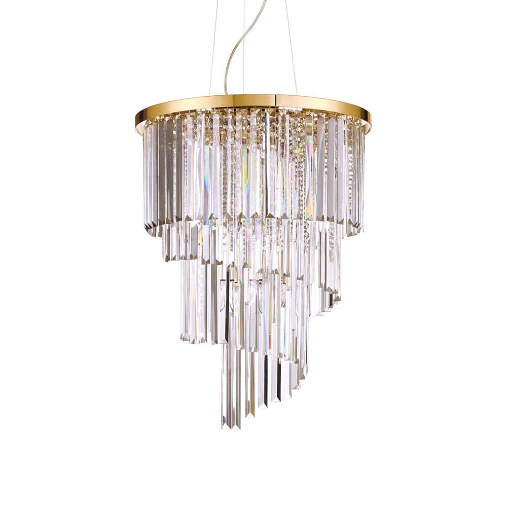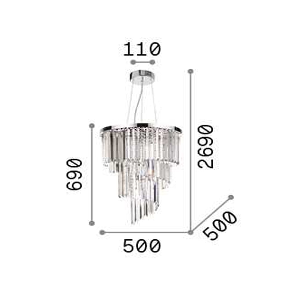 La lampada a sospensione Carlton SP12 della collezione Carlton del brand Ideal-Lux è un’imponente e lussuosa aggiunta agli interni, caratterizzata da una sofisticata combinazione di metallo cromato o dorato e cristallo molato trasparente. La montatura in metallo cromato o dorato conferisce alla lampada robustezza e lucentezza, mentre gli elementi decorativi con catene di ottagoni e barre in cristallo molato trasparente aggiungono un tocco di eleganza e raffinatezza. Questo lampadario è progettato per creare un’impressione di grandiosità e glamour, perfetto per ambienti come salotti, sale da pranzo o ingressi, dove può diventare il punto focale dell’arredamento. La combinazione di materiali di alta qualità e design sofisticato rende la Carlton SP12 una scelta ideale per coloro che cercano un’elevata qualità estetica e un’eccellente illuminazione.
