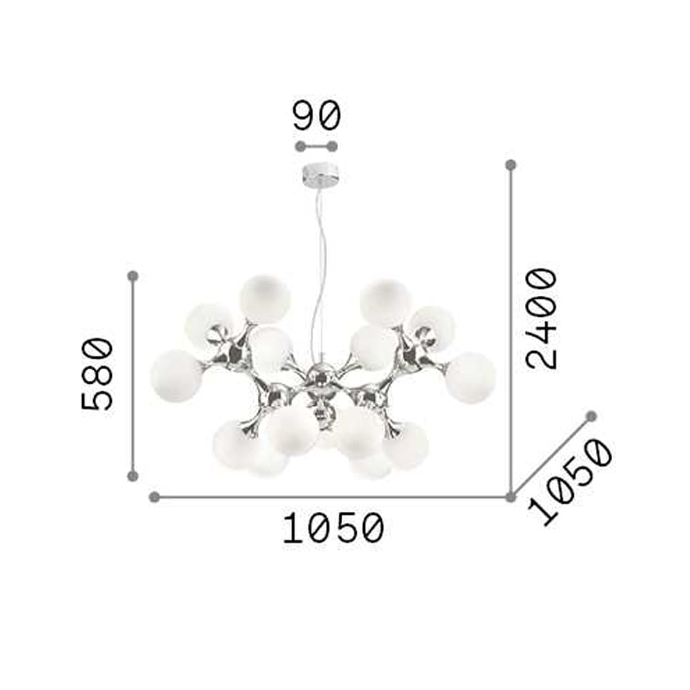 Sorgente Luminosa: E14 max 15 x 28 W (lampadina non inclusa) – 220-240V – dimmer determinato dalla lampadina- IP20. Dimensioni: H min 830 / max 2400 mm Ø 1050 mm