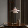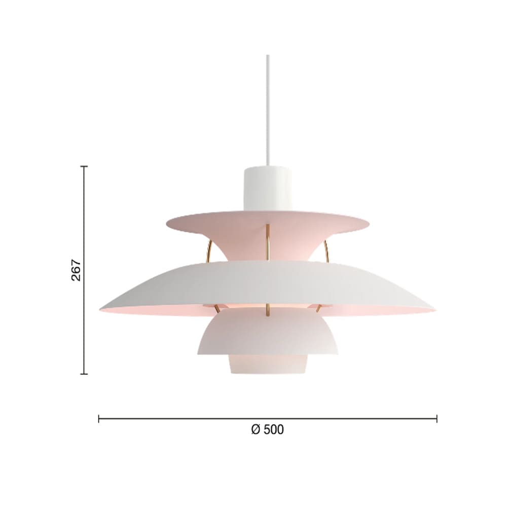 Poul Henningsen sviluppò la PH 5 nel 1958 in risposta ai continui cambiamenti nella forma e nelle dimensioni delle lampadine a incandescenza, creando una lampada che poteva essere utilizzata con qualsiasi sorgente luminosa. Il design iconico si basa sugli stessi principi del sistema a tre schermi di Henningsen, che garantisce una luce morbida, piacevole e completamente priva di abbagliamento, rendendola la lampada da tavolo perfetta per la sala da pranzo.Inizialmente, la PH 5 era dotata di schermi rossi e blu per migliorare il colore della luce, ma questi sono stati rimossi nei design successivi poiché le sorgenti luminose moderne riproducono la luce diurna in modo molto più efficace di quanto non lo facessero nel 1958.Disponibile in diverse varianti di colore, la PH 5 è una lampada a sospensione molto amata e nota, presente in molte case in tutto il mondo. Questa edizione anniversario è dipinta in bianco opaco all’esterno, con rosa pallido all’interno, che fornisce una luce morbida e calda, mentre i supporti in ottone metallizzato aggiungono un tocco di bellezza.