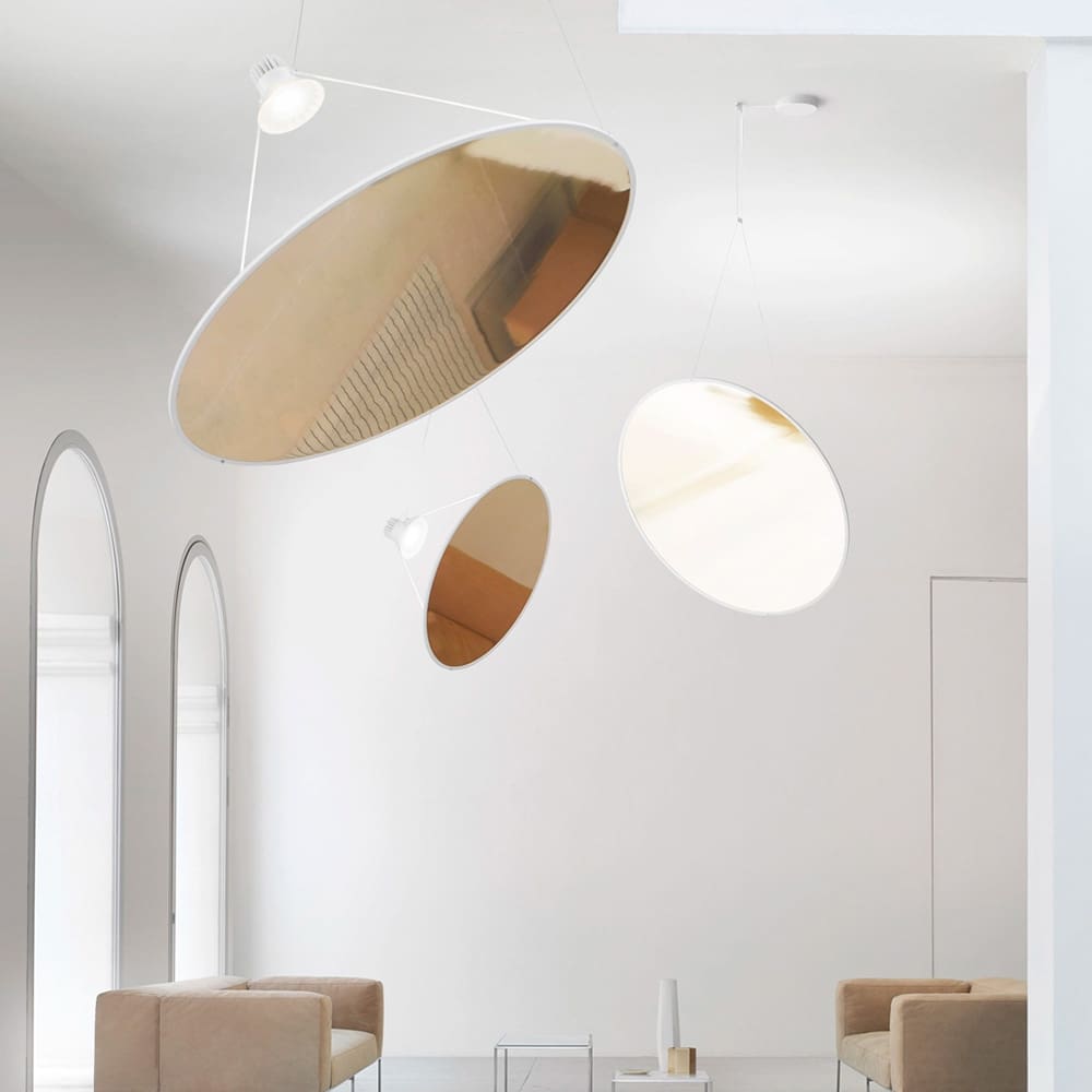 Amisol Sospensione di Luceplan, progettata da Daniel Rybakken, è una lampada a sospensione innovativa che massimizza la presenza scenica riducendo il volume fisico. Il suo design sofisticato è caratterizzato da un grande disco leggerissimo, disponibile con membrana a specchio metallizzata o film bianco traslucido, teso all’interno di un profilo circolare in alluminio. Una sorgente luminosa altamente potente proietta la luce sul disco, generando un’illuminazione diffusa o riflessa. Sottili aste connettono il disco alla sorgente luminosa, permettendo di regolare l’inclinazione grazie a un meccanismo di sospensione flessibile. Il risultato è una lampada scenografica e versatile, perfetta per ambienti moderni ed eleganti, in cui il design minimalista incontra la massima funzionalità luminosa. Disponibile in diverse finiture e dimensioni.