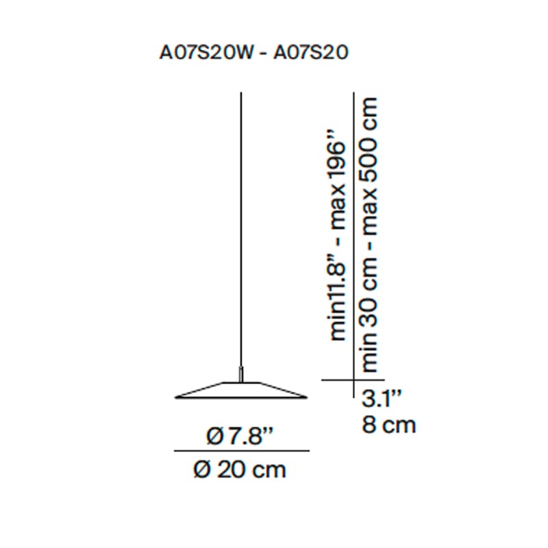 Sorgente luminosa: LED Module 15W 2700K – CRI 90 – 220-240 V ~ 50/60 Hz. Dimensioni: Ø 20 cm H min 30 cm – max 500 cm