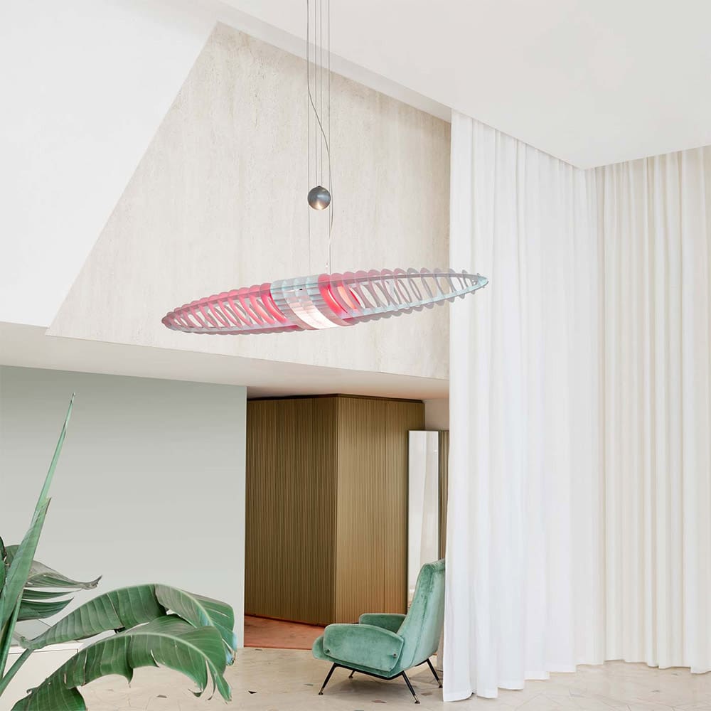 Queen Titania Sospensione, progettata da Alberto Meda e Paolo Rizzatto per Luceplan, è la versione ampliata della celebre Titania, pensata per l’illuminazione di grandi ambienti. Il suo design imponente e la struttura in centine di alluminio garantiscono un’estetica raffinata e una distribuzione luminosa ottimale. I filtri colorati intercambiabili in policarbonato permettono di personalizzare il colore della lampada senza alterare la qualità della luce bianca diffusa. Leggera e scenografica, Queen Titania diventa protagonista dello spazio, offrendo un’illuminazione versatile e sofisticata. Grazie al contrappeso regolabile, l’altezza può essere facilmente adattata alle esigenze di ogni ambiente. Perfetta per spazi ampi, hotel, sale conferenze e contesti contract, è una soluzione di design contemporaneo, dove tecnologia e creatività si incontrano per dare vita a un’illuminazione esclusiva.