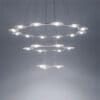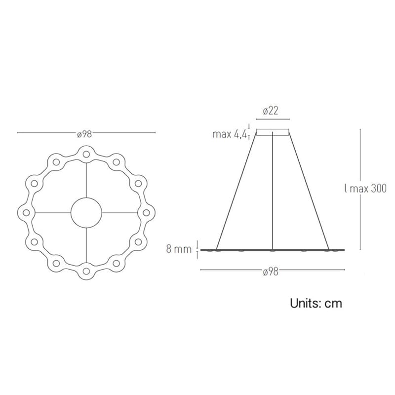 Sorgente luminosa: LED COB (incluso) – 75,6 w – 3000k – 220/240V-or-110/120V – 6800 lumen – CRI>90 – IP20 – 220/240V:TRIAC; 110/120:PUSH/1-10V . Dimensioni: Ø 98 cm H 0.8 cm Ø rosone 22 cm