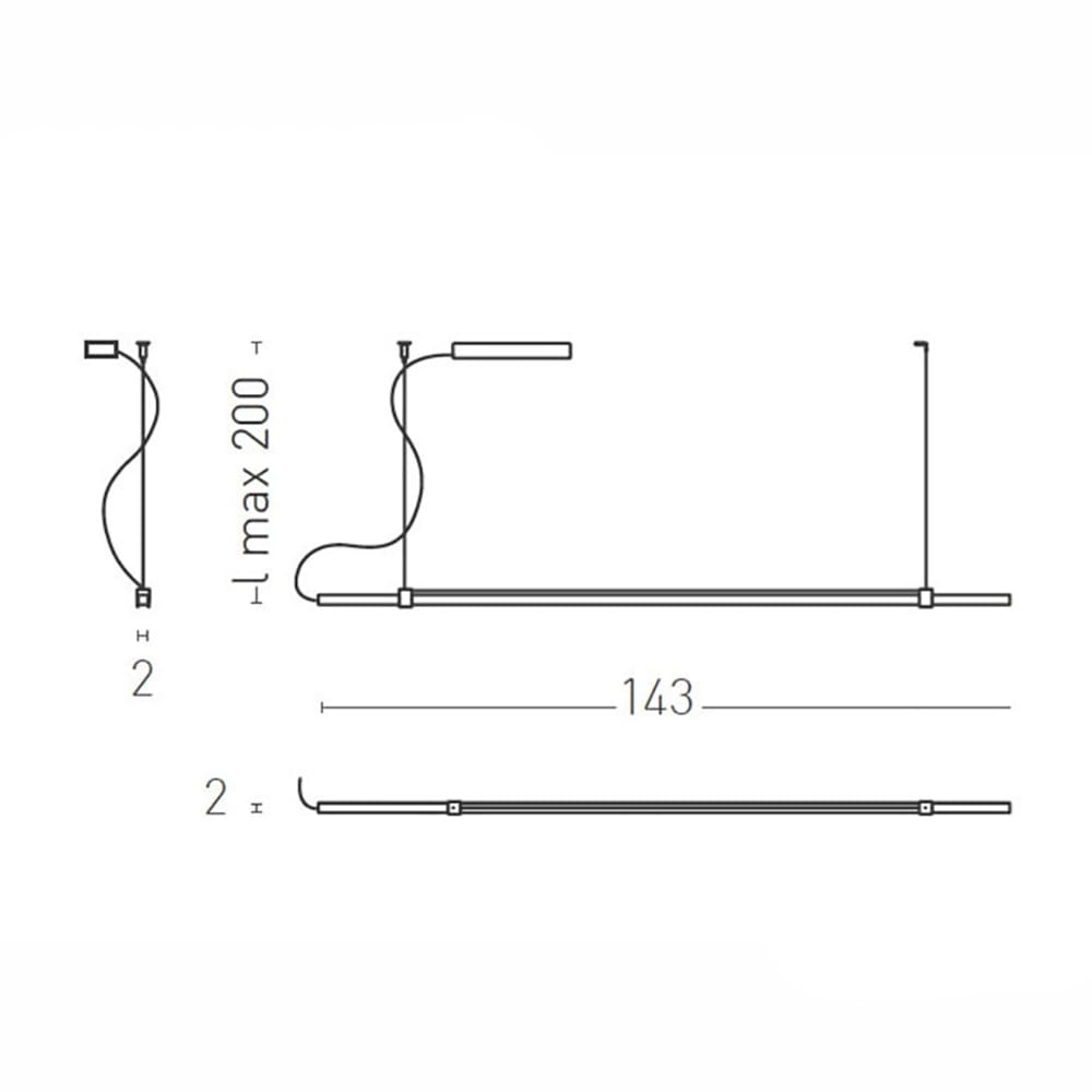 Sorgente luminosa: LED SMD – 28W – 2700K – 3360 lumen – CRI>90 – Driver elettronico: TRIAC – Dimmer Incluso – IP 20. Dimensioni: L 143 cm W 2 cm H 200 cm