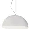 Lampada a sospensione a luce diffusa. Diffusore in metacrilato trasparente nel colore giallo o arancione e opal bianco. Supporto in metallo cromato. Per lampadina a Led. Disponibile in due dimensioni.