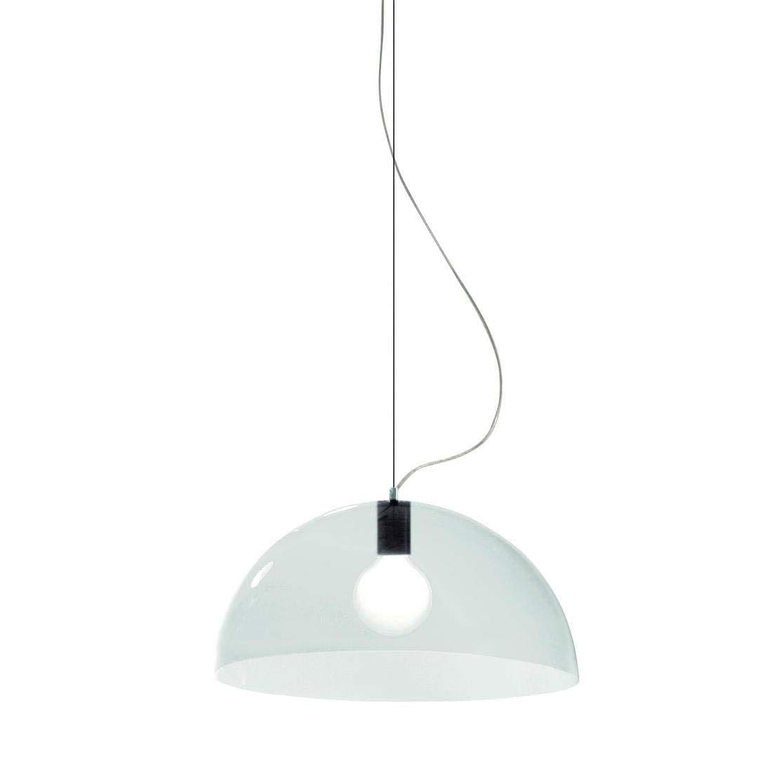 Lampada a sospensione a luce diffusa. Diffusore in metacrilato trasparente nel colore giallo o arancione e opal bianco. Supporto in metallo cromato. Per lampadina a Led. Disponibile in due dimensioni.