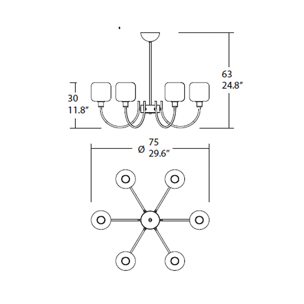 Sorgente luminosa: LED 6 x 4W E14 (inclusa) – 230 V – IP20. Dimensioni: Ø 75 cm H 63 cm