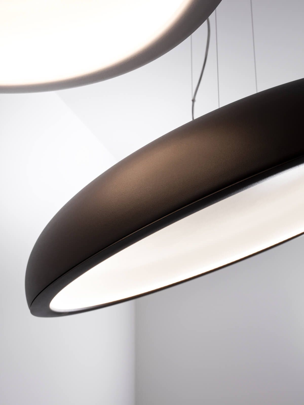 Plafoniera a sospensione di forma rotonda con sorgente perimetrale nascosta alla vista. La luce viene riflessa e convogliata nell’ambiente circostante dal riflettore a cupola, per un’illuminazione indiretta morbida e molto confortevole. In metallo, la plafoniera a sospensione Reflexio è disponibile in due dimensioni e nelle finiture total white oppure bicolor bianco/nero e bianco/chocolate brown. Dimmerabile in phase-cut. Il design, rimasto invariato, ha permesso alla famiglia Reflexio di aggiudicarsi il prestigioso IF Design Awards 2018.