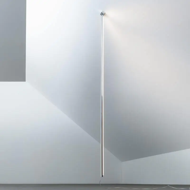 Lampada a sospensione verticale dotata di ottica WallWasher, che lava le pareti con una luce morbida e soffusa. Sorgente topLED e corpo in alluminio lucido oppure bianco dal carattere deciso, nel quale si inserisce un diffusore in PMMA. Dettaglio funzionale, lo snodo posto all’estremità permette di mantenere un orientamento perpendicolare al suolo anche con installazione su soffitti inclinati quali, ad esempio, le mansarde. Perfezione geometrica e tecnologia si incontrano in questa lampada rigorosa, dotata di spina, ideale per illuminare gli interni di strutture ricettive e residenze private. Accensione tramite sfioramento di un pulsante touch.