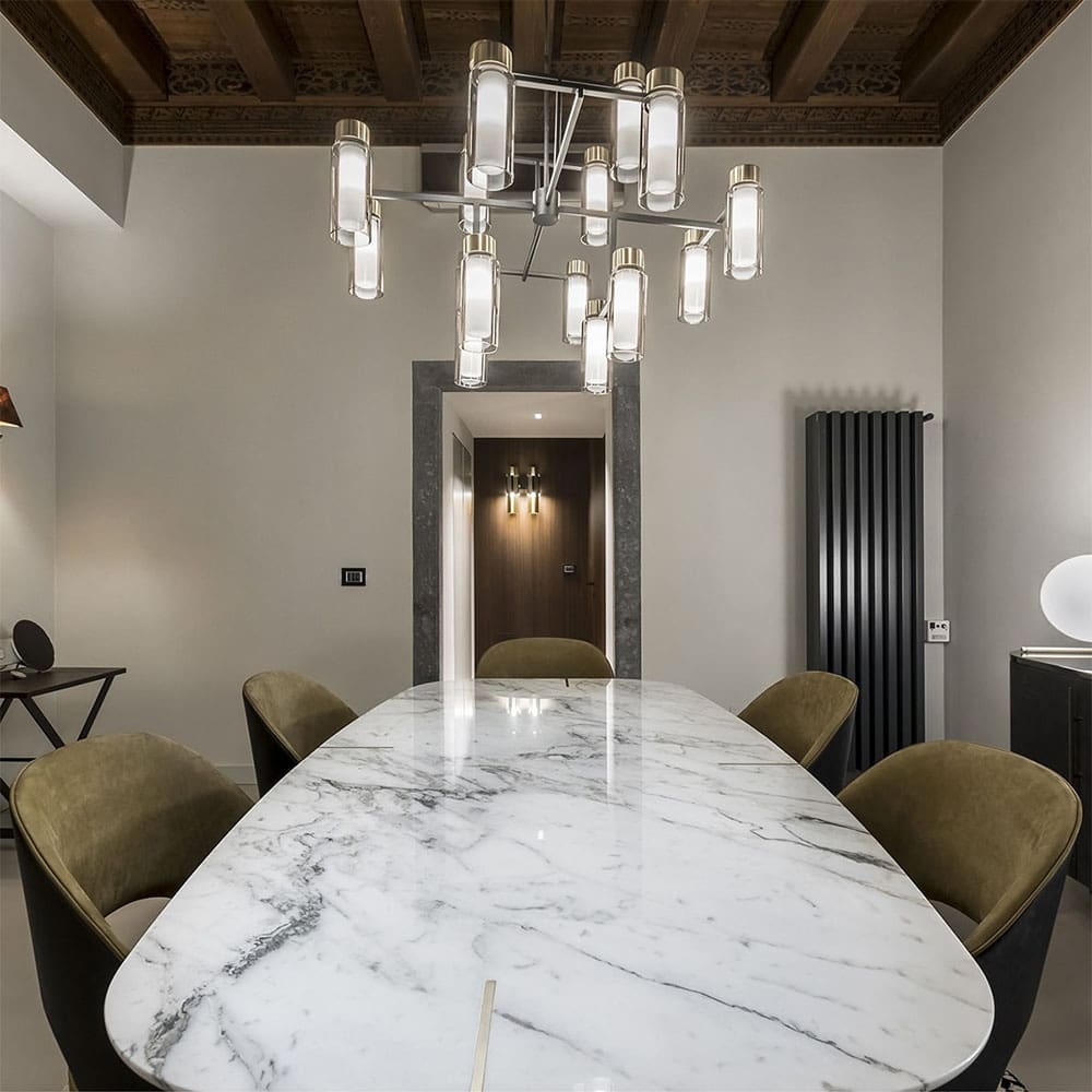 OSMAN 560.17 Chandelier, lampada a sospensione del marchio Tooy, disegnata da Corrado Dotti, è un elegante esempio di design razionale e contemporaneo. Questa famiglia di lampade si distingue per la struttura ortogonale dalle proporzioni equilibrate, arricchita da dettagli metallici preziosi e diffusori cilindrici a doppia parete. I diffusori creano una diffusione luminosa affascinante e armoniosa, che valorizza gli ambienti con un’illuminazione raffinata e calda. L’unione tra un segno avanguardistico e un aspetto formale familiare rende la OSMAN 560.17 Chandelier perfetta per ambienti moderni e ricercati, come soggiorni, sale da pranzo o spazi commerciali di rappresentanza. Questa lampada combina estetica sofisticata e funzionalità, offrendo un elemento d’arredo unico che si adatta a molteplici stili di arredamento.