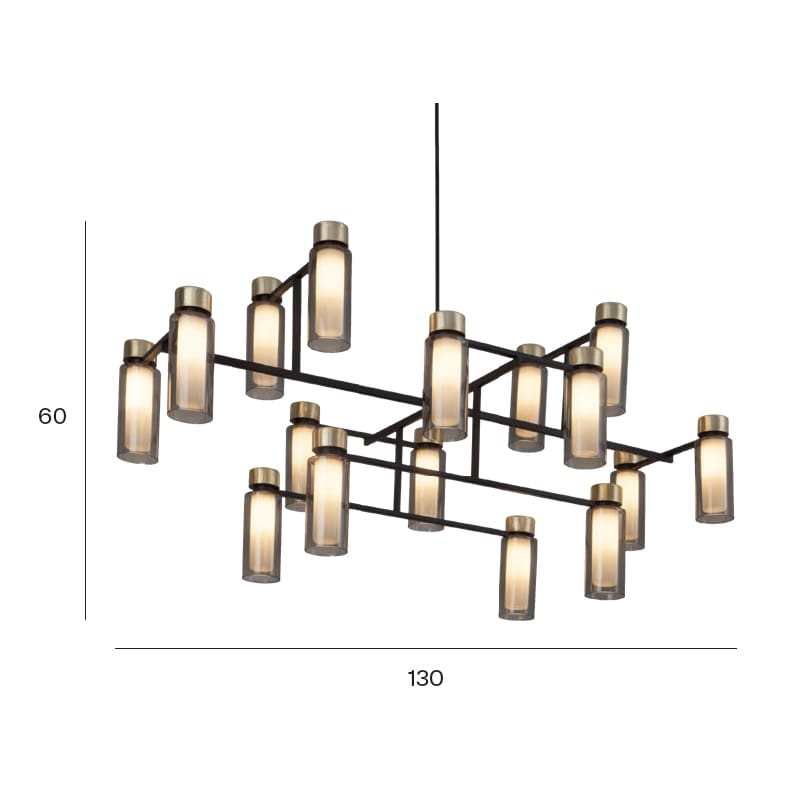 Sorgente luminosa: LED 16 x 8 W E14 (non inclusa) – 500 lumen – 220/240 V – Dimmer in base alla lampadina – IP20. Dimensioni: L 130 cm W 70 cm H 60 cm