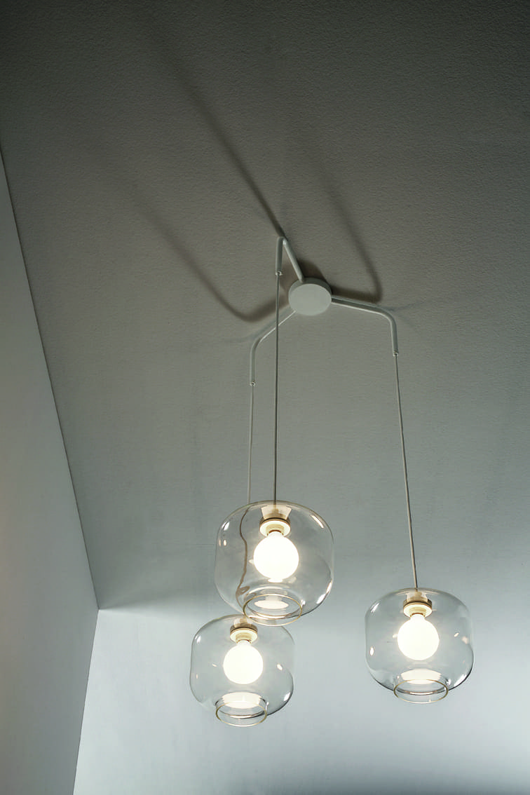 Vesoi Ambaràba Cicì Cocò 60-s3 Lampadario a sospensione composto da struttura in ottone o acciacio. 3 diffusori in vetro soffiato naturale o con parziale decoro.