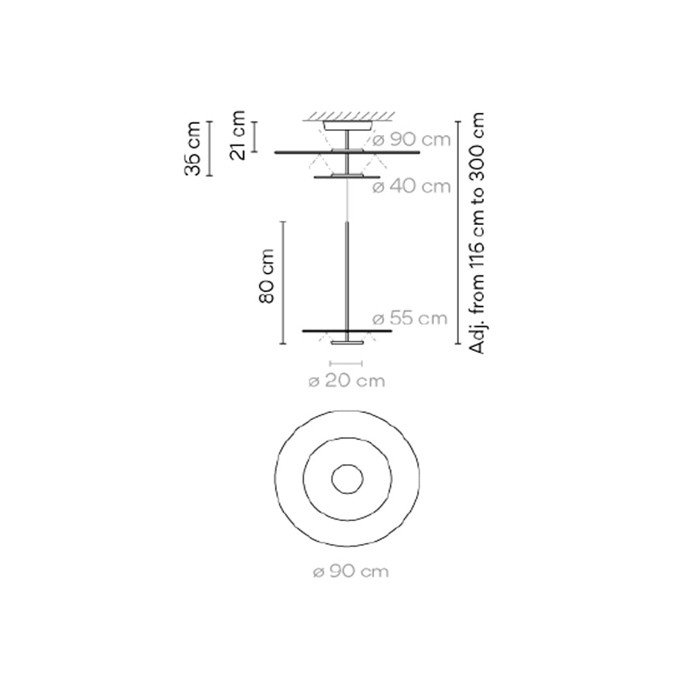 Sorgente luminosa: 3 PIASTRA LED 25W 2700K 700mA – 10440 lumen – CRI>90 – IP20 – 100-240V 50-60Hz- Driver incluso – dimmerabile Dali, 1-10V, Pulsante. Dimensioni: H 800 mmW 900 mm Ø 900 mm