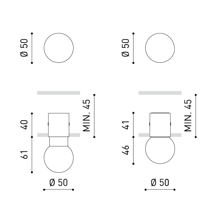 Sorgente luminosa: LED 4,5W – 3000K – 500 lumen – CRI>90 – driver esclusi – IP44. Dimensioni: Ø 50 mm H 61 o 46 mm