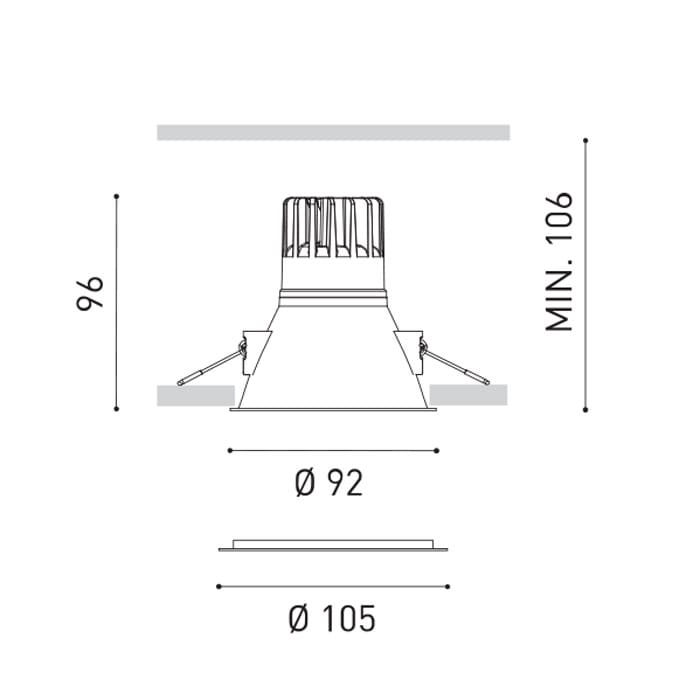 Sorgente luminosa: LED 7W 3000k – 940 lumen – 40°- CRI>90 IP20 – non dimmerabile. Dimensioni: incasso Ø85mm