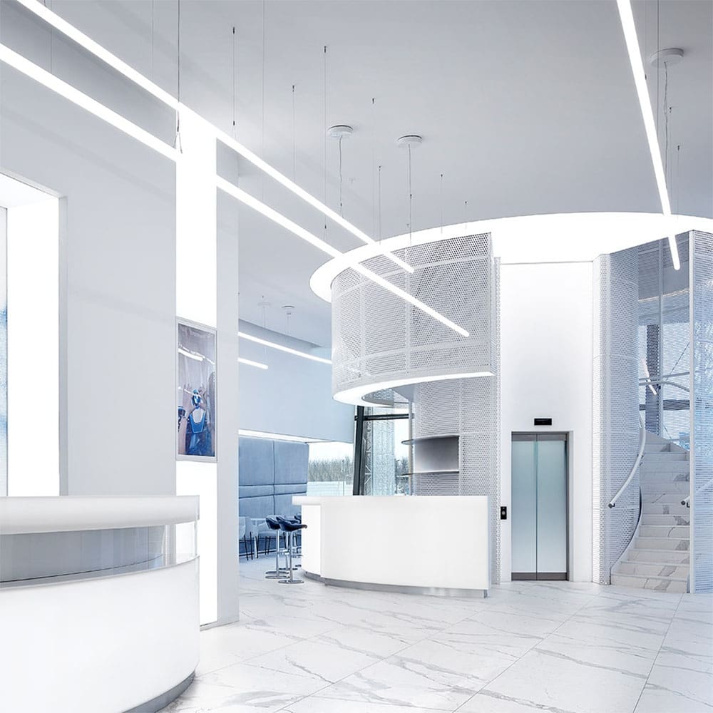Sorgente Luminosa: LED 33 W – 3500 K – 3400 lumen – CRI=90 – APP,Push/DALI – IP20. Dimensioni: L 1790 mm