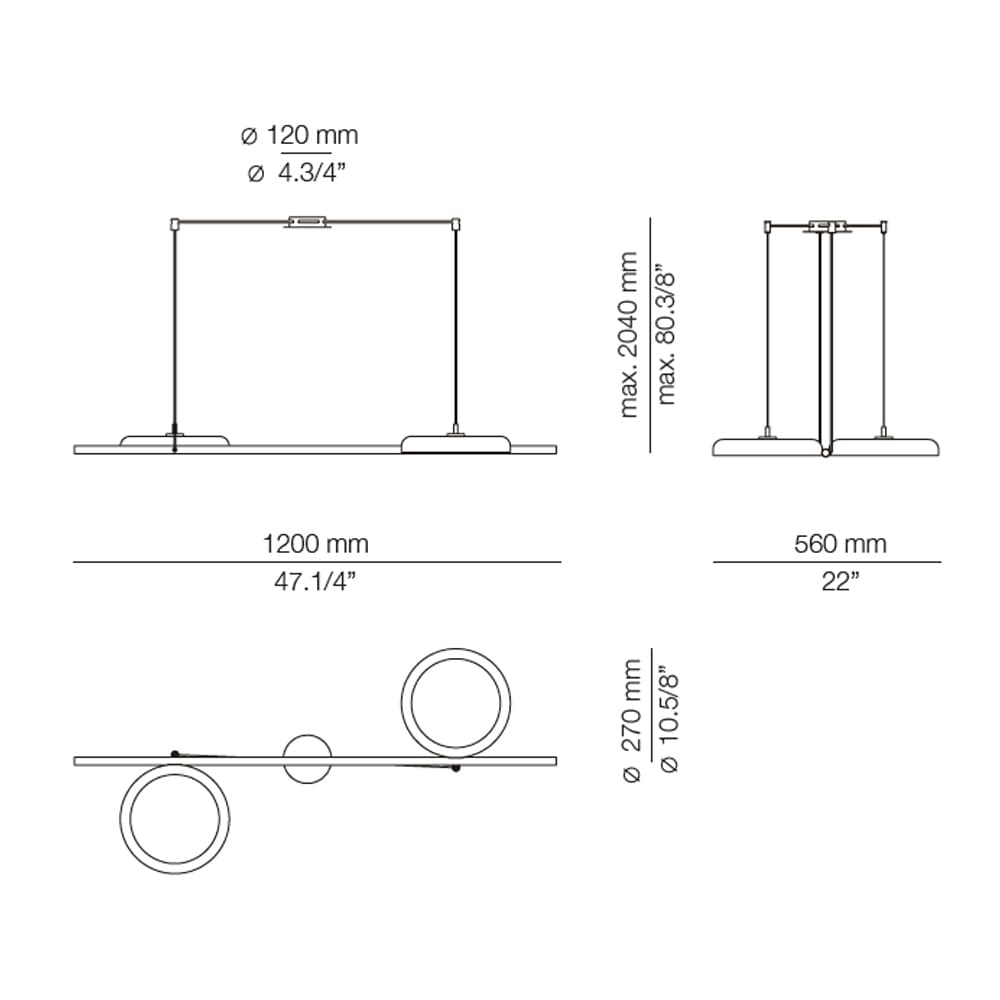 Sorgente luminosa: LED 2x19W 2700K – Ang.120º – >80CRI – 24V – 230V- 2×1800 lumen – driver incluso – dimmerabile TRIAC. Include: 1 rosone ad incasso 113820XX3, 1 T-4062 e 2 driver 671000049. Dimensioni: ⌀120 mm, base 1200mm, H max. 2042