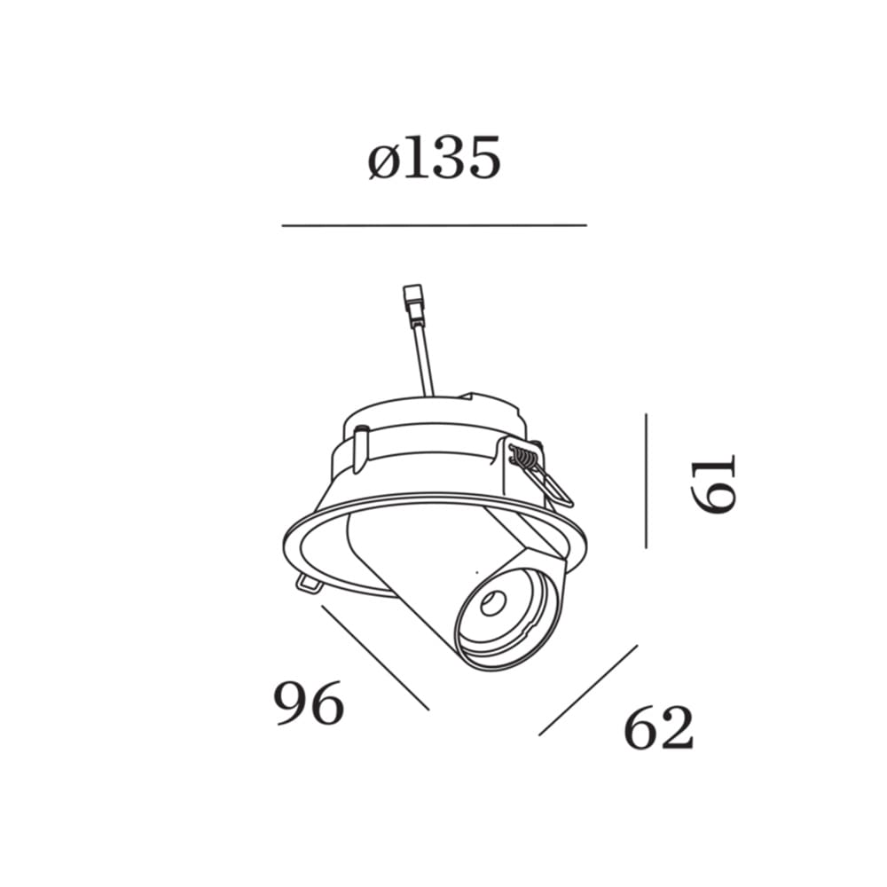Sorgente Luminosa: PAR 16 max.12W GUI10 – 100 – 240 V – IP20. Dimensioni: H 61 mm Ø 135 mm