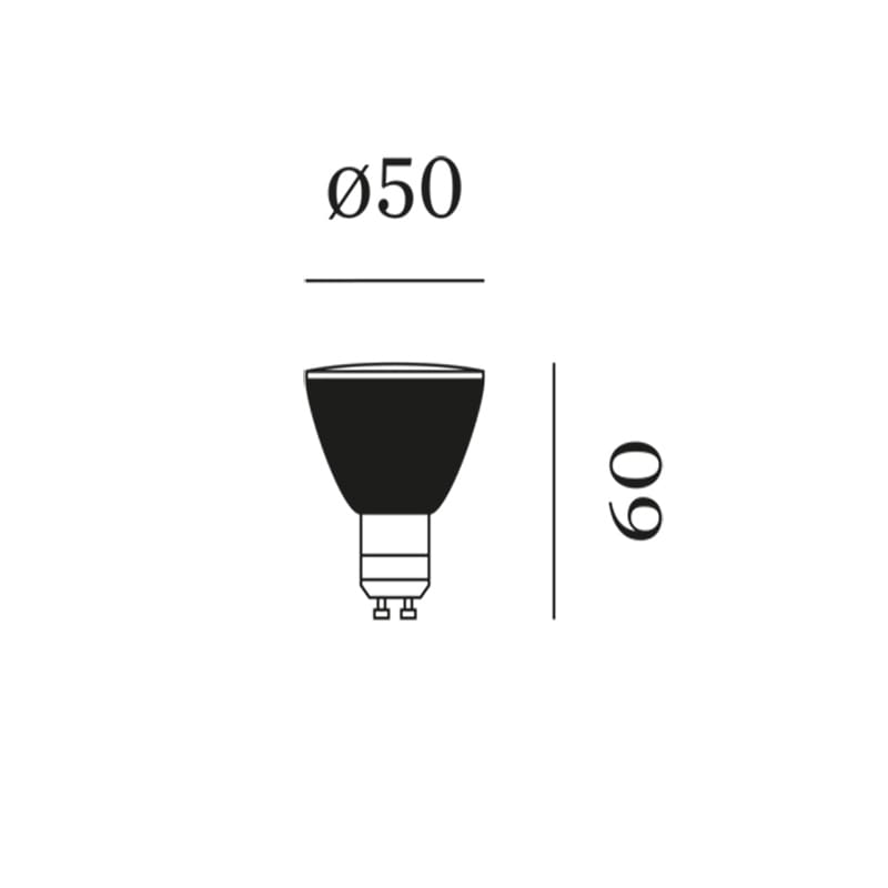 Sorgente Luminosa: PAR 16 max. 6,5 W GUI10 – 2700 K – 437 lumen – CRI>90 – dimmer a taglio di fase – 220/240 V. Dimensioni: H 60 mm Ø 50 mm