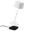 Base di ricarica a contatto per Ofelia micro. Ofelia micro è una lampada da tavolo a batteria, portatile e ricaricabile. Nella parte superiore della testa è presente un controllo “touch”, che permette l’accensione, la regolazione dell’intensità luminosa e la selezione della temperatura di colore della luce tra 2200K, 2700K e 3000K.